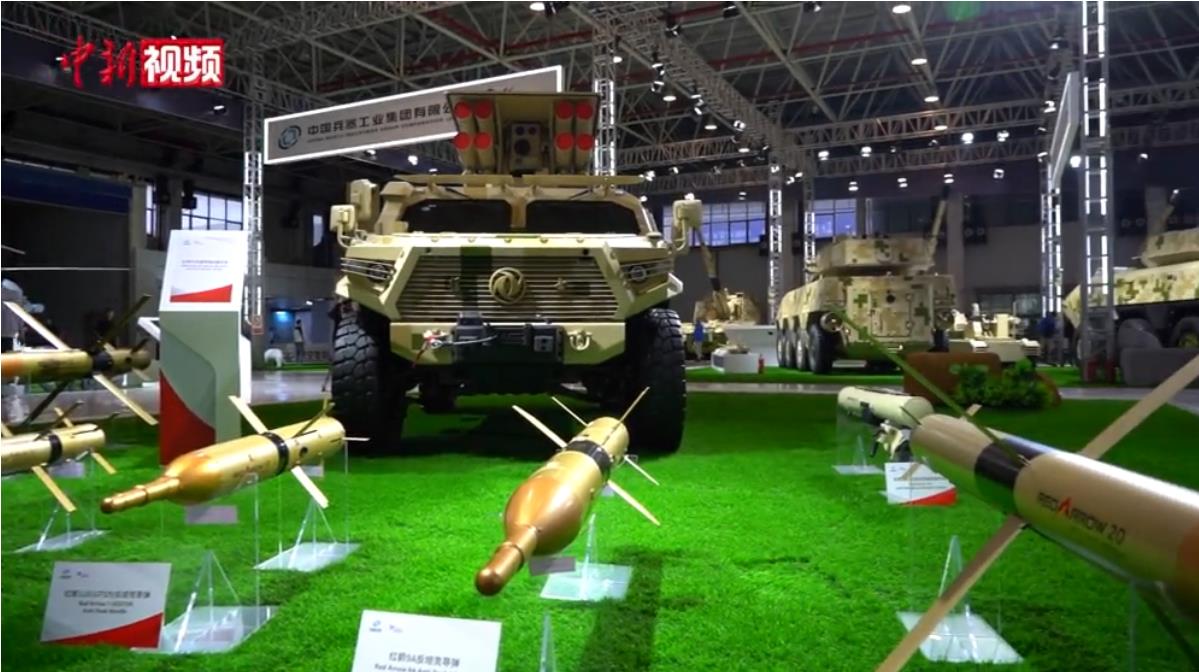 【解說】據介紹,中國兵器工業集團帶來的展品共計175款,其中52款為首次參展。在展館最顯眼處是一輛全新發布的升級款的VT4系列主戰坦克,它在態勢感知能力,有/無人協同作戰能力上有全面提升。